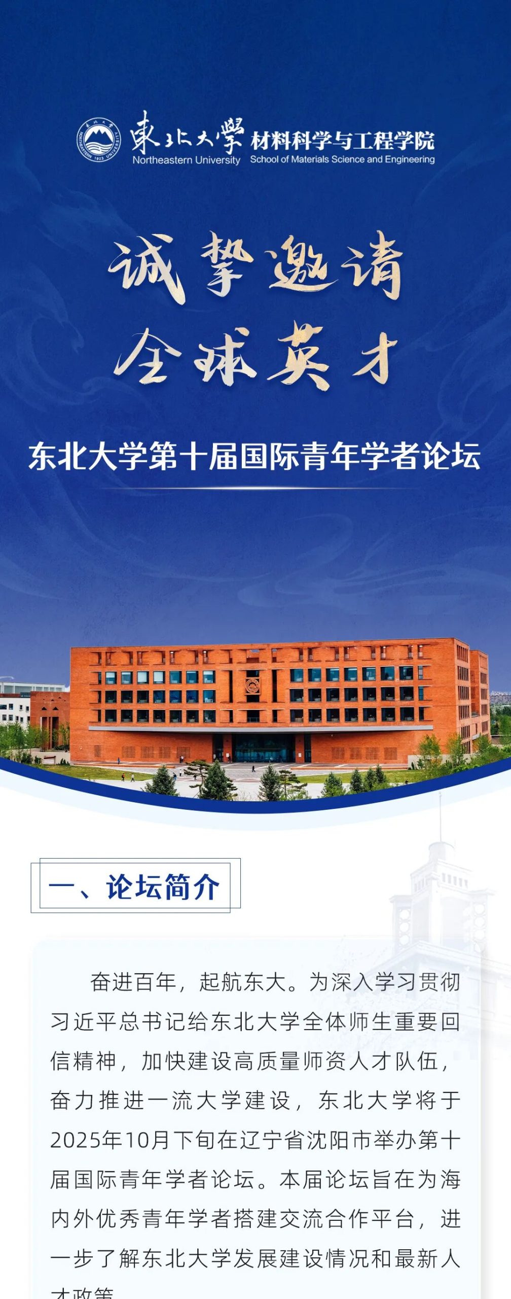 全球引才、待遇优渥!东北大学材料学院诚邀全球英才参加第十届国际青年学者论坛