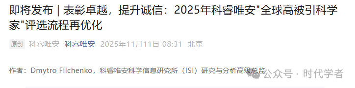 11月11日,科睿唯安宣布对2025年“全球高被引科学家”评选流程进行了优化,主要涉及论文筛选、现有遴选标准应用等,详细调整如下: