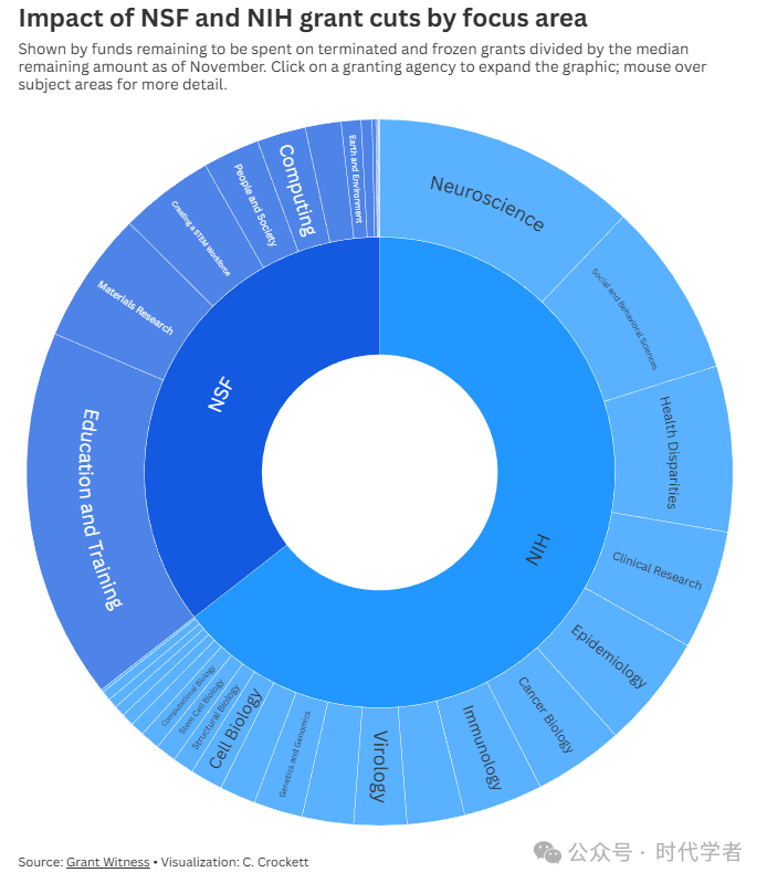 Science News近日报道,根据Grant Witness的不完全统计,截至2025年11月,特朗普政府已终止或冻结超过3800项美国国家科学基金会(NSF)和美国国家卫生研究院(NIH)的科研拨款,涉及未支付资金约30亿美元。其中,涉及NIH的约为23亿美元,与NSF相关的资助约为7亿美元。