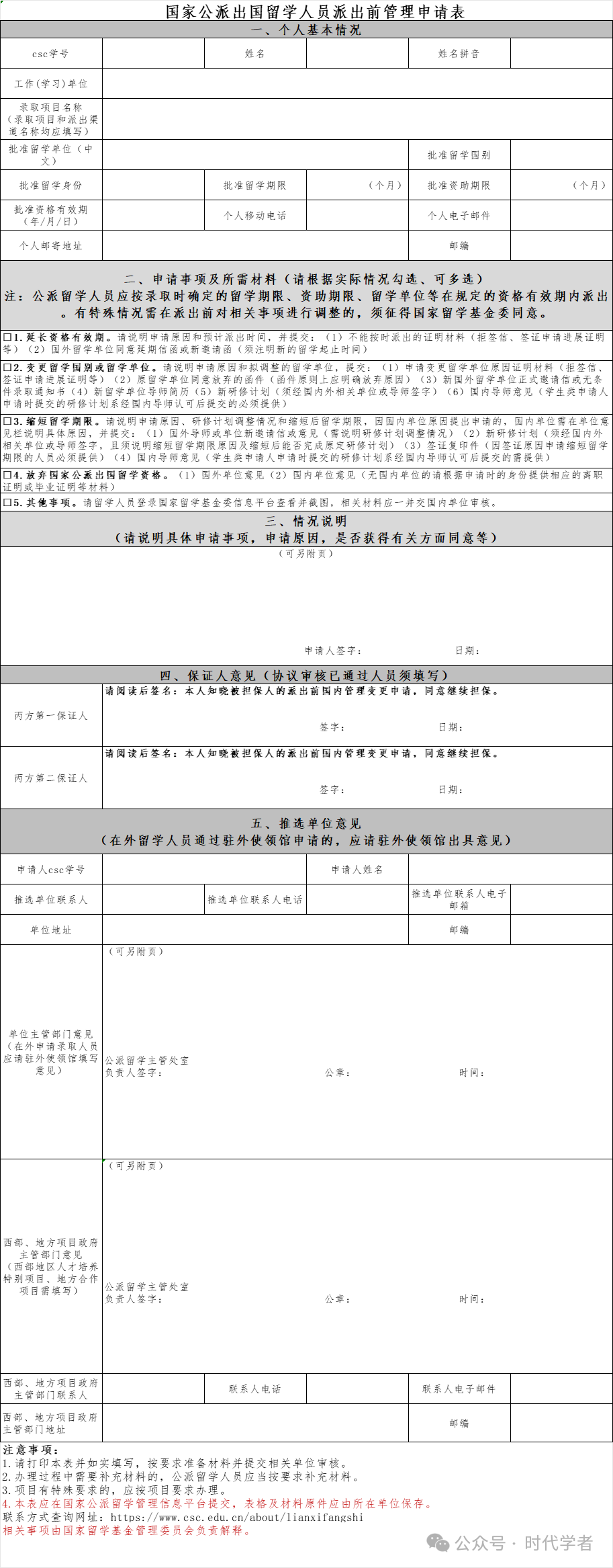 最新国家公派出国留学人员派出前管理申请表要求为: