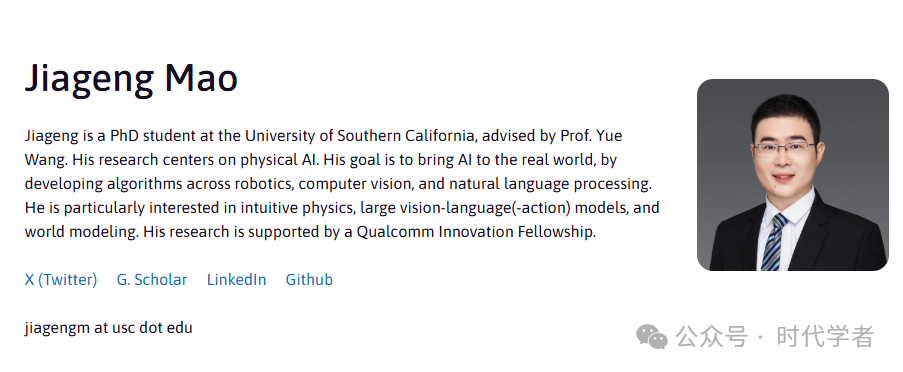 Jiageng Mao是南加州大学的博士生,师从Yue Wang教授。他的研究核心在于物理人工智能(Physical AI),致力于通过利用互联网规模数据中的多样化先验知识,解决复杂的物理世界问题。他的目标是为现实世界中的具身智能体(Embodied Agents)开发稳健且可泛化的智能系统,研究涵盖了自动驾驶、计算机视觉和机器人学习等前沿领域。