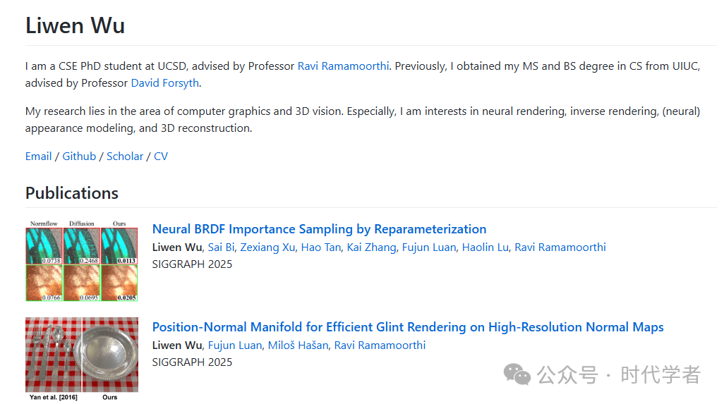 Liwen Wu是UCSD计算机科学与工程系的博士生,导师是Ravi Ramamoorthi教授。他的主要研究兴趣集中在计算机图形学和3D视觉的交叉领域,特别是神经渲染、反向渲染和材质建模。他致力于通过结合神经技术与物理渲染原理,提升渲染的真实感与计算效率,为创建逼真的虚拟世界提供技术支撑。