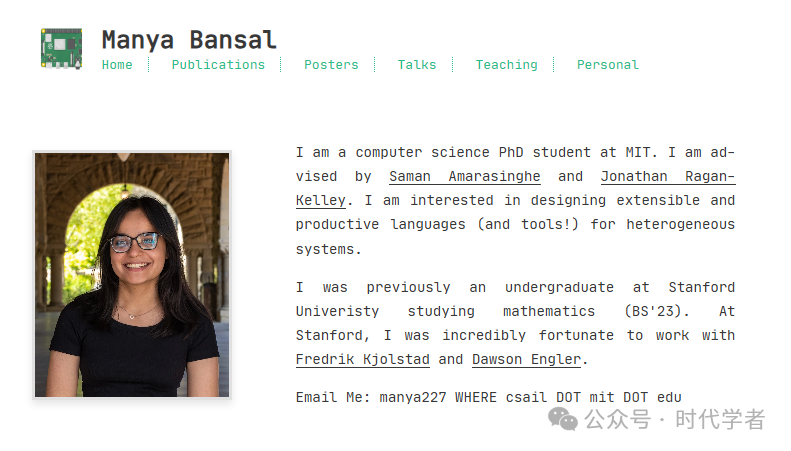 Manya Bansal是MIT的博士生,由Saman Amarasinghe和Jonathan Ragan-Kelley指导。她的研究致力于为现代硬件加速器设计新型编程语言和编译器。她开发的系统允许开发者编写模块化、可复用的高性能代码,旨在解决异构计算系统中的编程复杂性,同时保留对底层硬件的精细控制能力,以实现峰值性能。