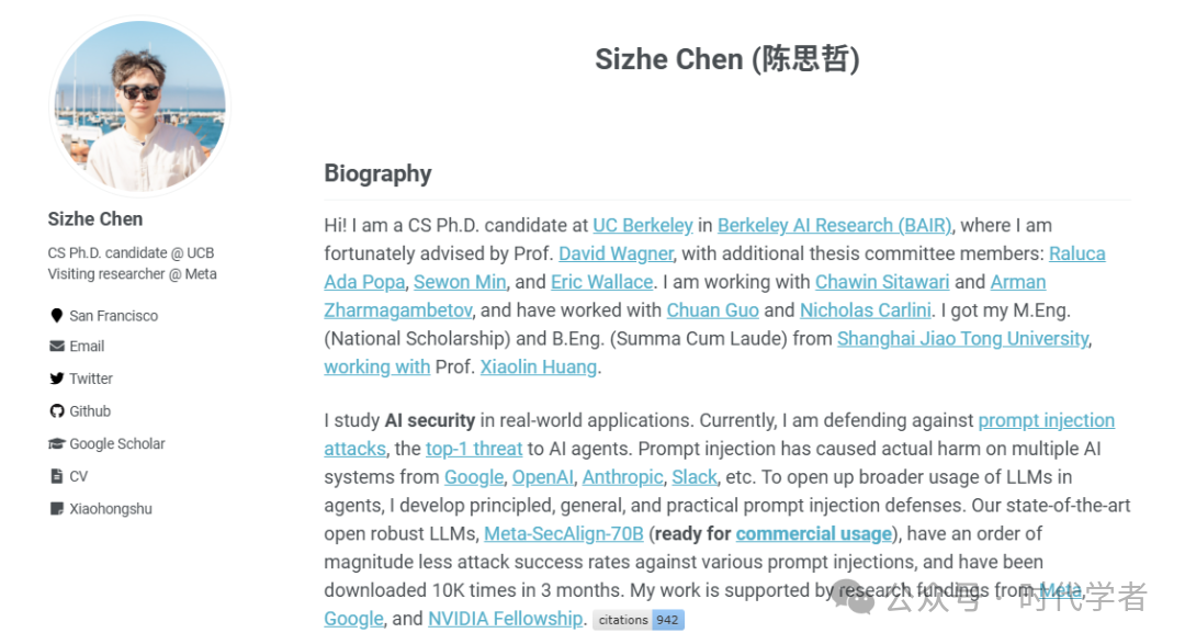 Sizhe Chen致力于人工智能安全领域的研究,重点关注现实场景中的模型防御机制。他目前的研究聚焦于大语言模型(LLM)和智能体(Agents)的安全性,特别是如何通过通用且实用的防御手段(如结构化查询防御)来保护智能体免受提示注入等攻击,同时确保智能体在执行任务时的功能完整性。