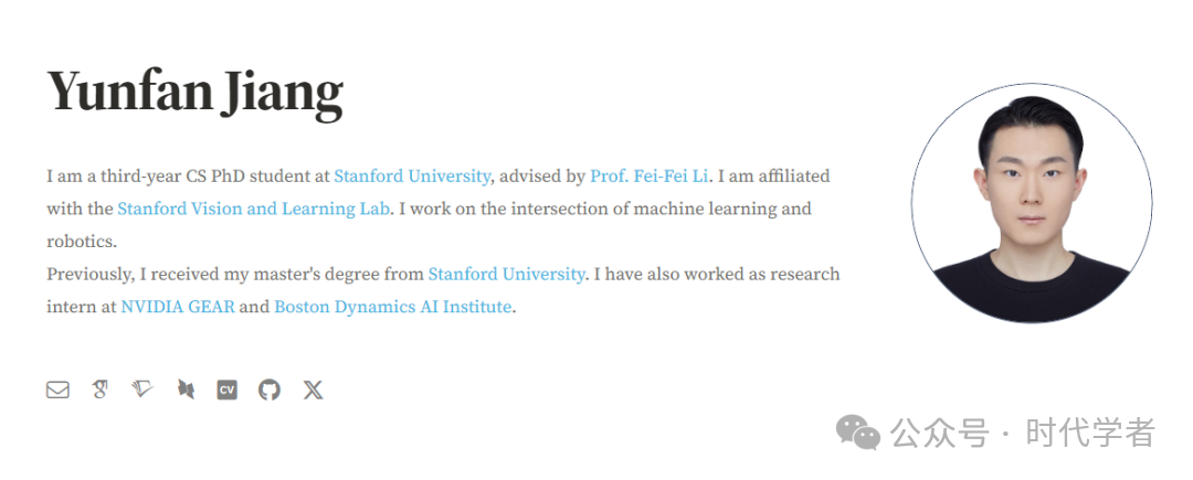 Yunfan Jiang是斯坦福大学计算机科学系的博士生,导师是李飞飞(Fei-Fei Li)教授。他的研究目标是构建通用的机器人系统,使其能够执行复杂的日常任务。他通过融合现实世界的全身操控数据、大规模仿真环境(如Minecraft)以及互联网级的多模态监督数据,开发可扩展的方法来训练具备高度适应性的机器人智能体。