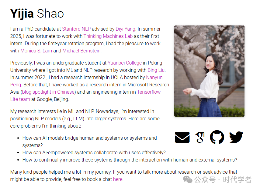 Yijia Shao是斯坦福大学的博士生,师从Diyi Yang教授。她的研究重点是人机协同(Human-AI Collaboration)。她致力于开发能够在任务执行过程中与人类进行有效沟通和协作的AI智能体,并设计新型的人机交互界面。她的工作旨在探索AI如何通过理解人类意图和反馈,更好地辅助人类完成复杂的知识密集型任务。