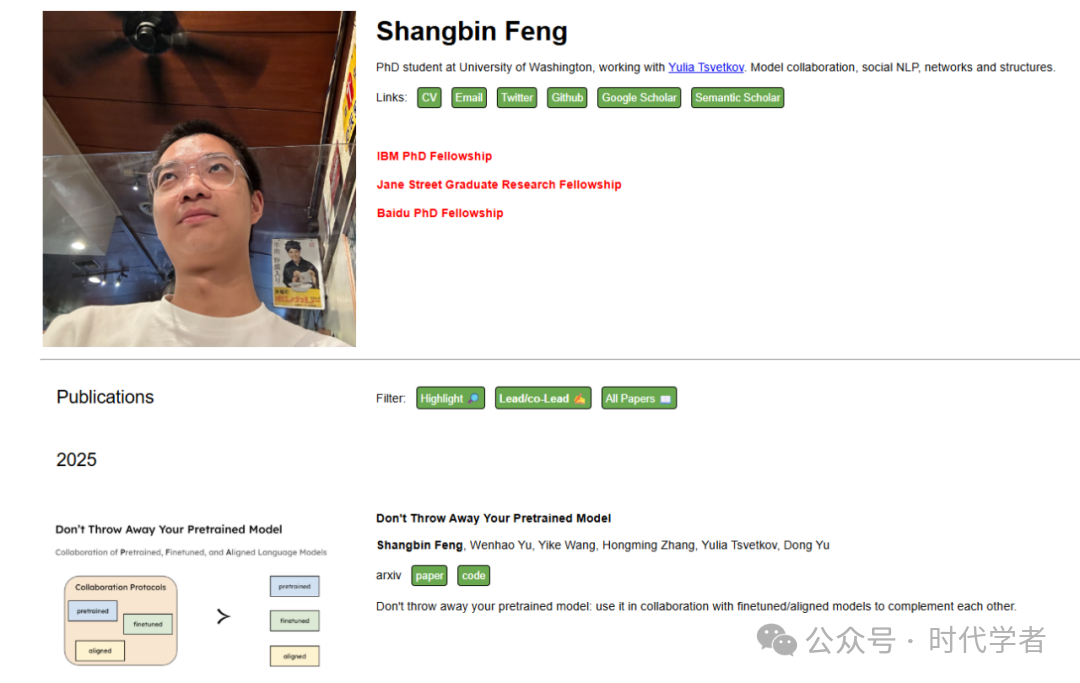 Shangbin Feng是华盛顿大学的博士生,导师是Yulia Tsvetkov。他的研究愿景是推动「模型协作」,即让多个在不同数据上由不同人员训练的机器学习模型能够相互协作、组合与互补。他致力于构建一个开放、去中心化且协同化的AI生态系统,解决单一模型在知识覆盖和隐私保护方面的局限性。