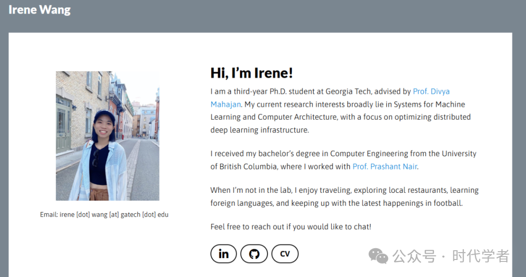 Irene Wang是佐治亚理工学院的博士生,导师是Divya Mahajan。她的研究致力于解决大规模AI训练中的效率与可持续性问题。她开发了集成加速器架构、网络拓扑与运行时调度的协同设计框架(Co-design Frameworks),旨在优化分布式深度学习系统的性能和能效,推动绿色AI计算的发展。