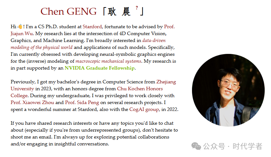 Chen Geng是斯坦福大学的博士生,导师是Jiajun Wu。他的研究兴趣位于计算机图形学与4D视觉的交叉点。他致力于利用可扩展的数据驱动算法和物理启发原理,对四维物理世界进行建模。他的工作推进了面向机器人与科学应用的物理基础三维与四维世界模型(World Models),特别是在动态场景的生成与理解方面。