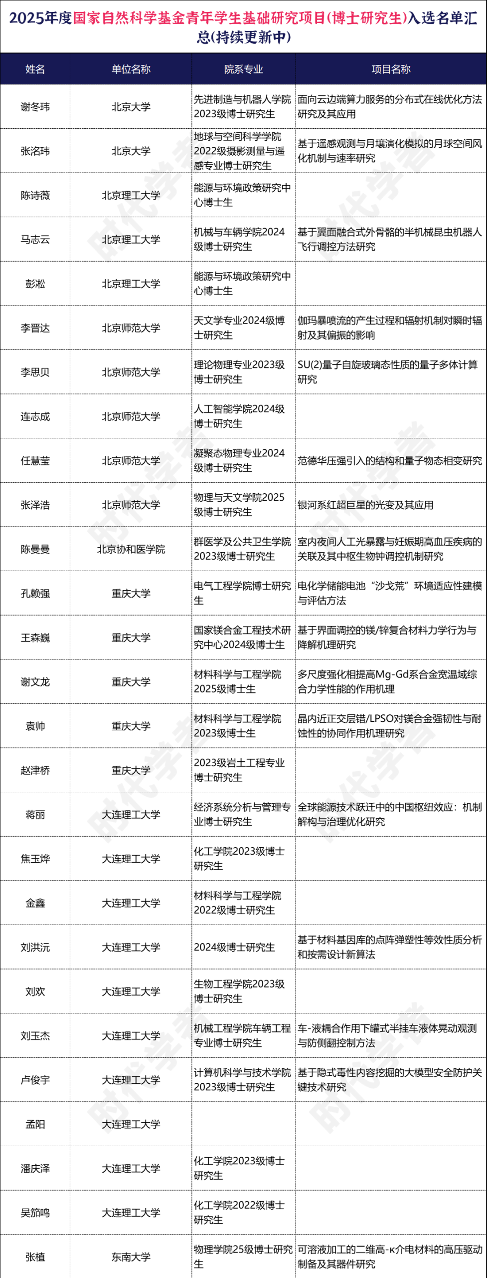 近日,国家自然科学基金委员会公布了2025年度国家自然科学基金青年学生基础研究项目(博士研究生)立项名单,国内多所院校官宣获批情况。