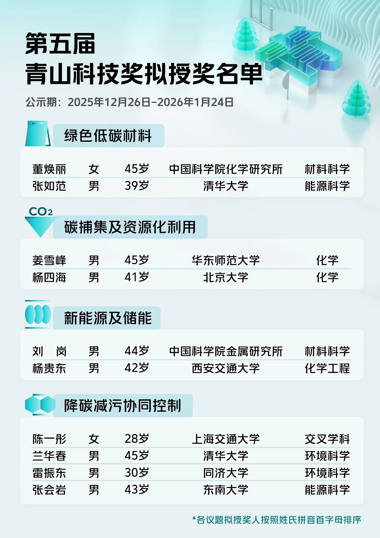 按照《青山科技奖章程》(下简称《章程》),经形式审查、初评、终评答辩环节,产生第五届青山科技奖拟授奖人选10人。根据《章程》第四章第十五条规定,对第五届青山科技奖获奖人、学科领域、议题进行公示。