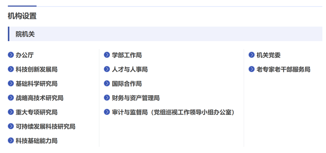 官网显示,目前,中国科学院院机关包括:办公厅、科技创新发展局、基础科学研究局、战略高技术研究局、重大专项研究局、可持续发展科技研究局、科技基础能力局,学部工作局、人才与人事局、国际合作局、财务与资产管理局、审计与监督局(党组巡视工作领导小组办公室),机关党委、老专家老干部服务局。
