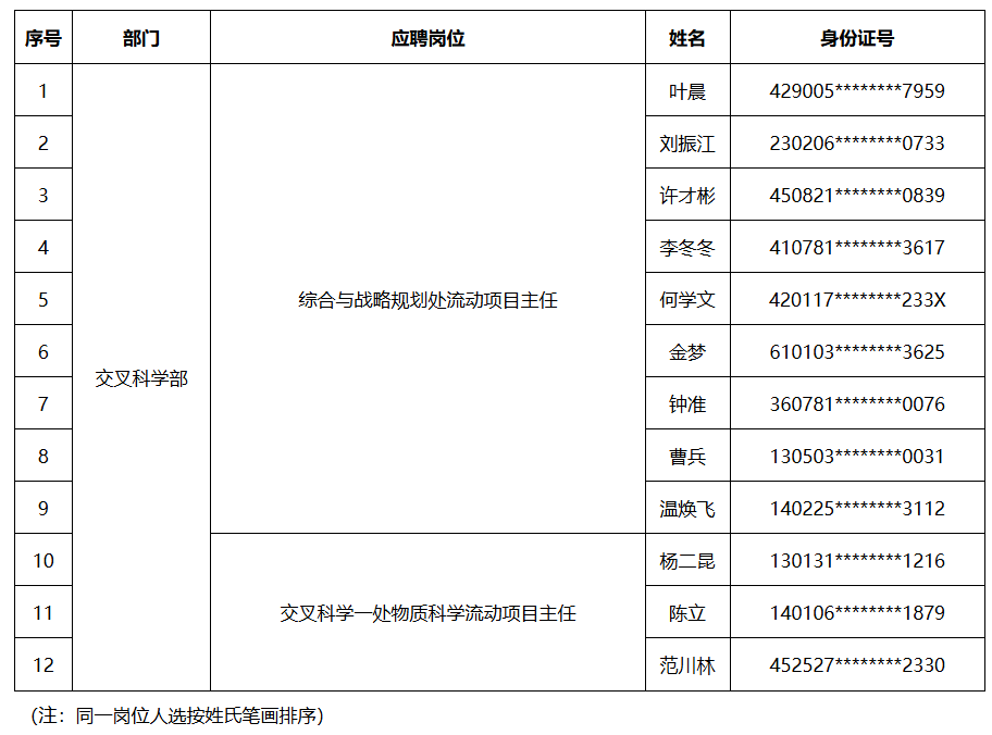 经招聘工作组研究,确定以下12位同志为交叉科学部综合与战略规划处流动项目主任、交叉科学部交叉科学一处物质科学流动项目主任等流动工作人员岗位的面试答辩人选。