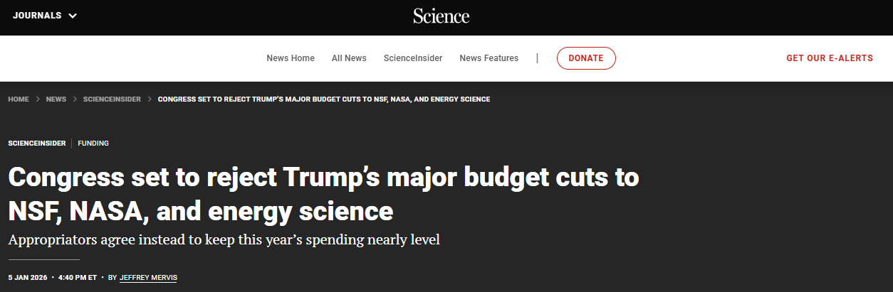 Science报道,根据最新拨款法案,美国国会基本否决了特朗普政府计划大规模削减多个科研机构预算的提案。参考当地时间1月5日公布的拨款法案,美国国家科学基金会(NSF)、美国宇航局(NASA)及美国能源部(DOE)等科研资助机构的拨款额度与当前基本持平,其预算降幅远低于特朗普政府原计划,美国能源部预算还将增加1.6亿美元。