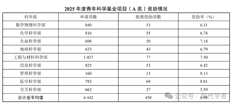 2025年度青年科学基金项目(A类)接收申请6442项,资助450项,资助经费为176760万元,整体资助率约为6.99%,具体各学部资助情况如下: