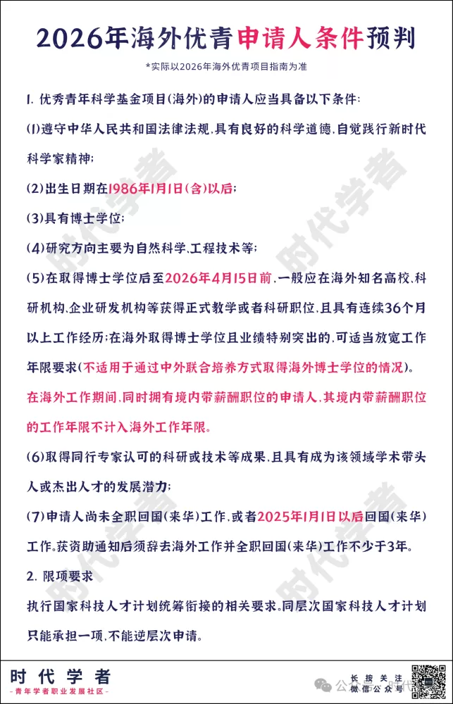 2026年申请人主要把握年龄、海外工作时间、回国时间这三点,涉及海外工作时间断档、期间境内有带薪酬职位的情形要酌情判断。