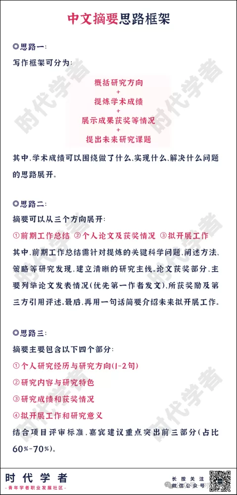 摘要部分高度概括了申请人的整体情况,也是评审专家习惯较早审阅的内容。一般来说,摘要部分包括主要研究方向及研究问题、介绍个人主要学术成绩及创新点、成果发表获奖和未来拟开展工作几大板块,其中主要学术成绩部分需重点阐述,并突出差异化优势。此外,中文摘要建议400字以内(含标点),超出部分无法填写,需要高度凝练。这里提供部分往年入选者的写作框架作为参考: