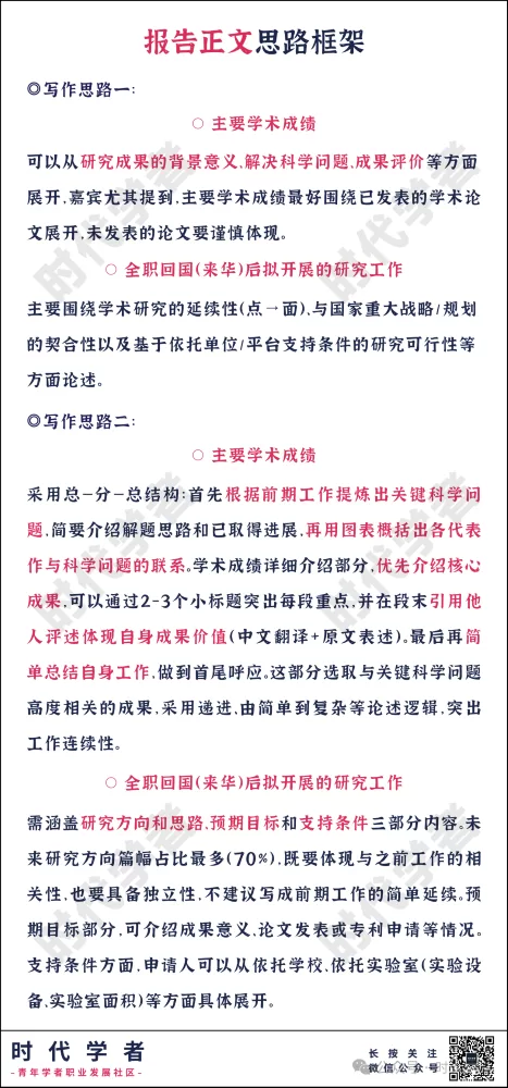 综合入选人经验来看,阐述主要学术成绩要提前搭建好整体逻辑框架,明确研究主线,不必局限于单篇论文或成果时间顺序。拟开展研究工作部分,未来研究方向既需要与前期工作有关联,更需要针对国家战略、领域内的关键科学问题进一步突破创新,并结合依托单位学校、院系及团队情况介绍具体、可量化的支持条件,明确项目可行性。这里分享一下往年入选人的写作思路: