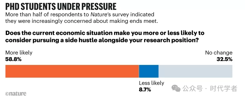 调查结果显示,46%的受访科研人员在攻读博士学位期间拥有第二收入来源。同时,68%的人对所在地区的当前经济形势感到担忧,约59%的人表示,这种担忧会促使他们从事副业。
