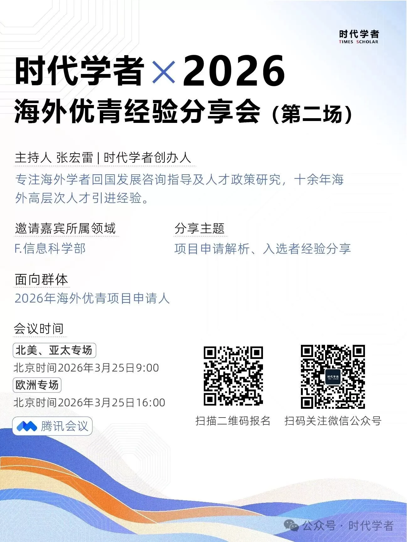 海外优青项目申请重要节点,时代学者按照往年惯例将于2026年3月25日举办第二场海外优青经验分享会公益活动,邀请往届入选人介绍写作技巧与实战经验,欢迎申请人报名参会!